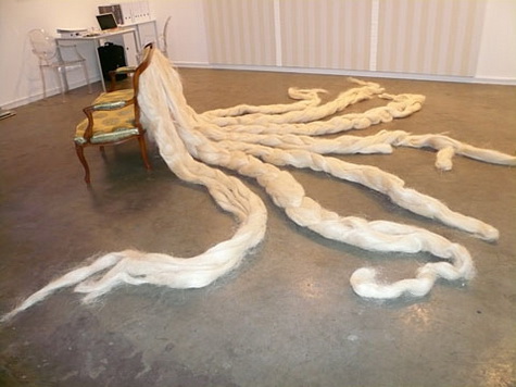 ST : Hair, especially long braid, a very traditional image associated with women. You have magnified it by ten times and let it flow from windows, from the seat-back of a chair, etc. How did you start using hair as a creative element?