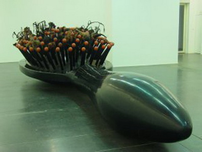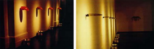 Shen Yuan [SY] : The tongue has several levels of meaning and possibilities. In art, there is a dual metaphorical sense of the tongue, i.e. the physical and the spiritual; physical because it’s part of the body; spiritual because it’s a language, a tool. In my work, the tongue is more about the later, i.e. the spiritual. For example, the ice-tongue in Perdre sa salive (1994)… I like very much to use the ice as the material, it’s very fragile, easily melt into nothing. However, when you touch it with your hands, its chill pierced into the marrow. Visually, it’s unstable, in an eternal process of changing, of transforming. There are people who find it erotic, because it’s part of the body. It arouses physical excitement. Inside, at the core of it, is a knife, which is a tool. In another case, the 12-meter-long inflatable tongue that stretches out from the wall to astound the audience, becomes an invader of the space, at the same time poses a potential physical attack on to the audience. The tongue itself is offensive, just like language. In another installation, 80 fabric tongues dart out of a constellation of hair dryers like party poppers can be very neurotic.